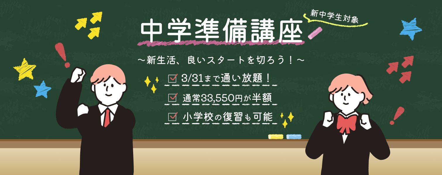 新中学1年生になる方へ、先着8名様まで、最大12時間で通常33,550円が、なんと16,500円で受講できる特別な「中学準備講座」を開講します。